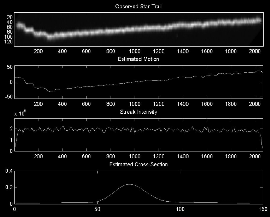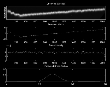 Our motion estimation algorithm attempts to attain the "best of both worlds." It ignores the cross-sectional gaussian blur while very accurately producing a path through the image. We actually construct the path with subpixel accuracy by bicubically rescaling the input up by a factor of 8x before applying the motion estimation algorithm. The rational for this is that the graylevels present in the original image define a curve which may not be best matched at an integral pixel boundary. The motion estimation method performs visibly better than the bad cases of the other two methods, and not worse than the good cases. In fact in the high resolution images this method looks somewhat better than the good cases too. We can also trivially extract cross-sectional diagrams and intensity curves as part of this method. The adjacent image shows (from top to bottom): the original star trail from a chunk of the image, the path our motion tracking algorithm found, the intensity of the streak as computed using the norm of each individual cross-section, and the estimated intensity distribution of the cross-section. Note that the motion tracking path we compute, which we use as a point spread function, very accurately fits the original star trail. Also note that the average cross-section of the original observed star trail very precisely fits the expected gaussian model. We do find the intensity variations to be quite large. We attribute these fluctuations to a combination of vibrations and atmospheric turbulence. As this is an absolute scale and changes are registered over several pixels, we do not believe the observed fluctuations can be the result of noise in the camera. |