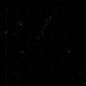On the left, our photograph of the Beehive cluster exhibits some early vibration that is roughly perpendicular to the direction of motion. We believe that the vibration may have been caused by the camera's mirror flipping or perhaps the shutter. This nonlinearity is absent from our image of the Orion Nebula. Neither of these images has been rotated; the differing directions of stellar motion are due to them having been taken in different areas of the sky.