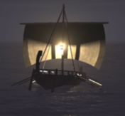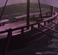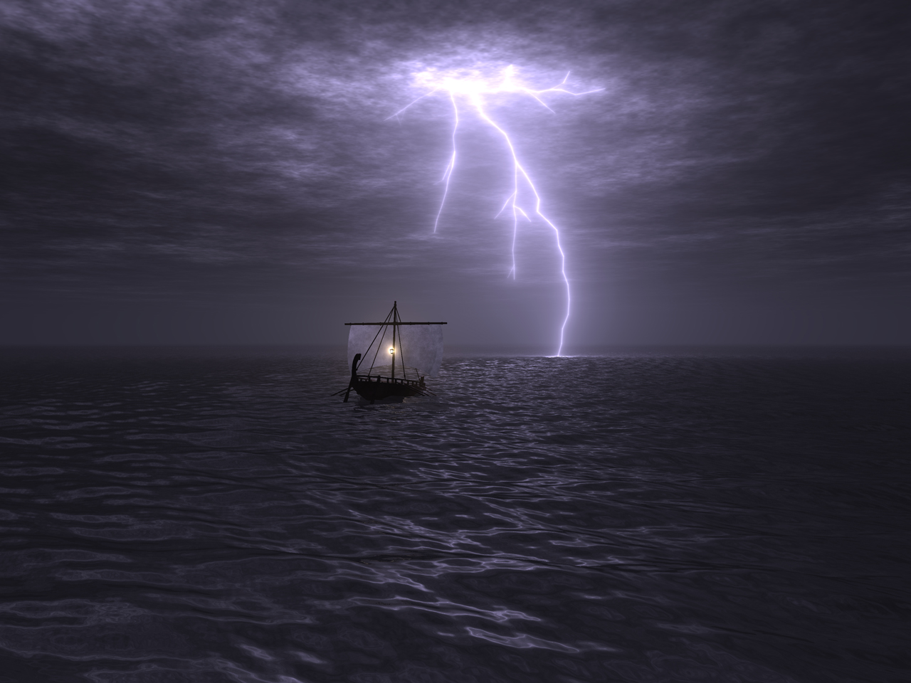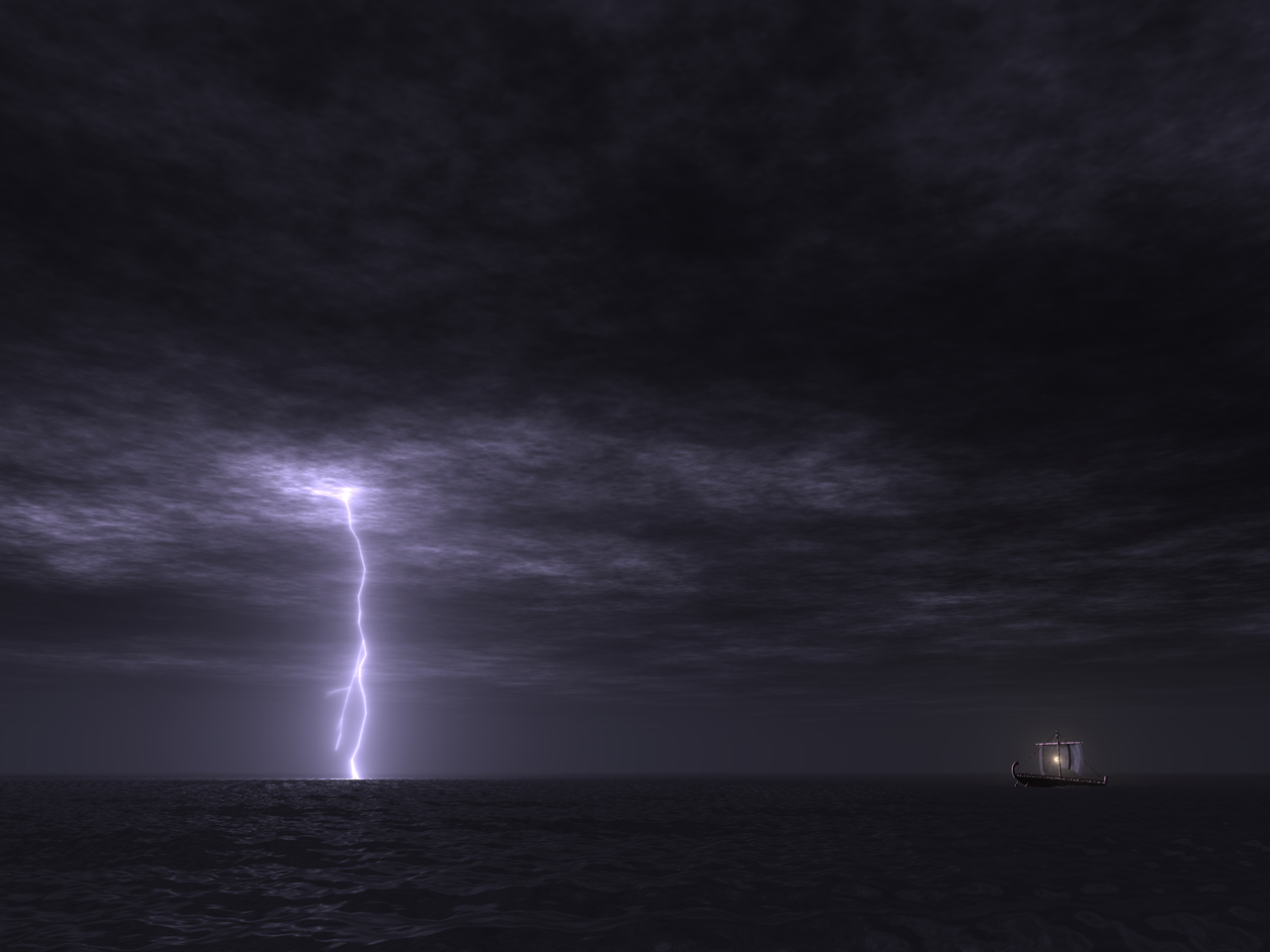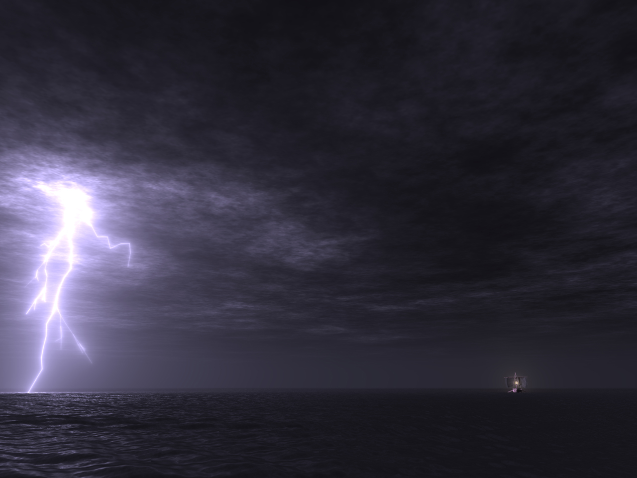 The final images were rendered at 3600 by 2700 pixels with 100 shadow rays per eye ray, and then resampled down to 1280 by 960 to reduce aliasing. The close-up image of the boat with the purple lightning took about 8 hours of rendering time, and the distant views took about 1 hour each.